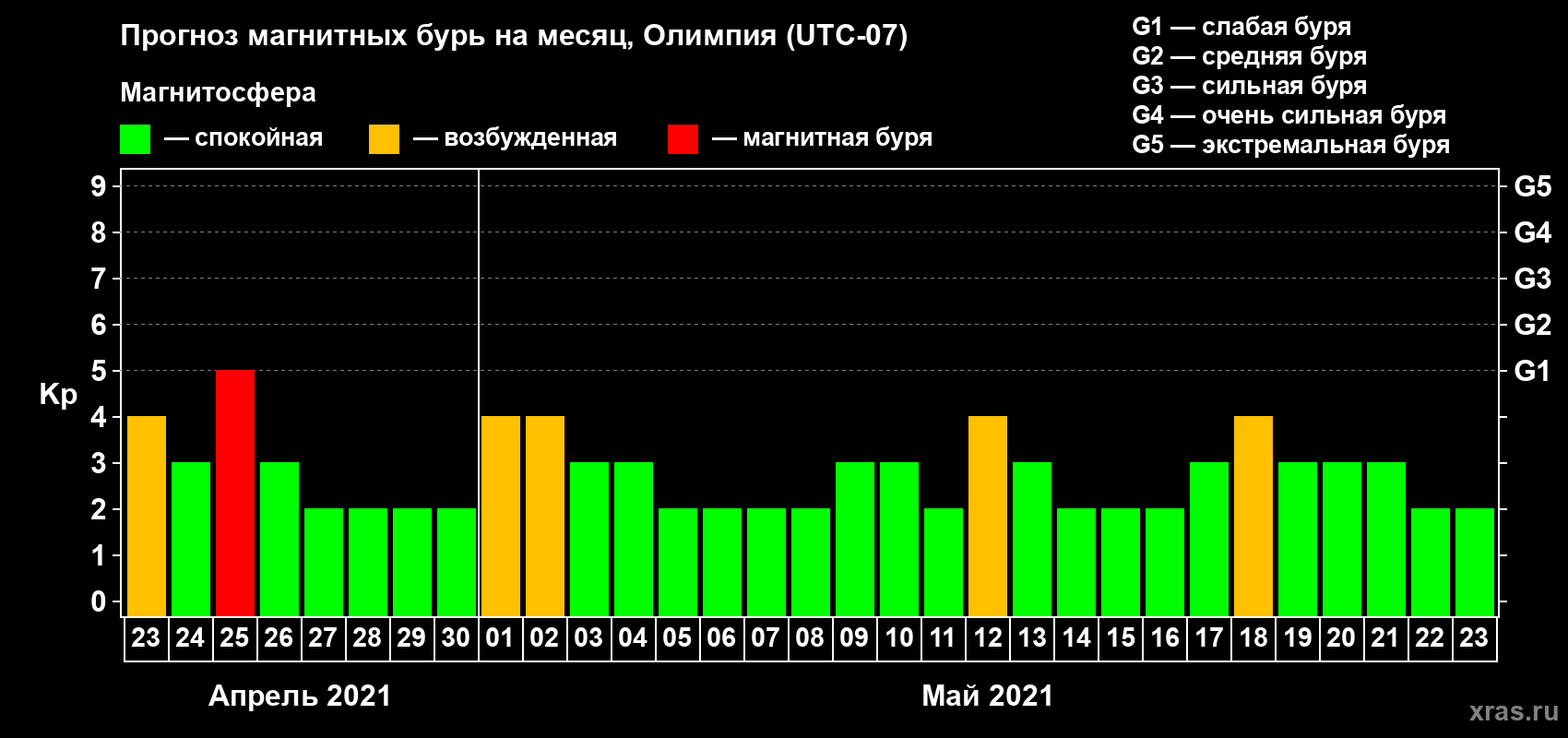 Прогноз магнитных бурь в Олимпии — 23 апреля 2021 года