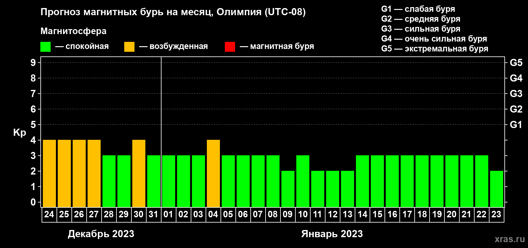 Прогноз магнитных бурь в Олимпии — 24 декабря 2022 года