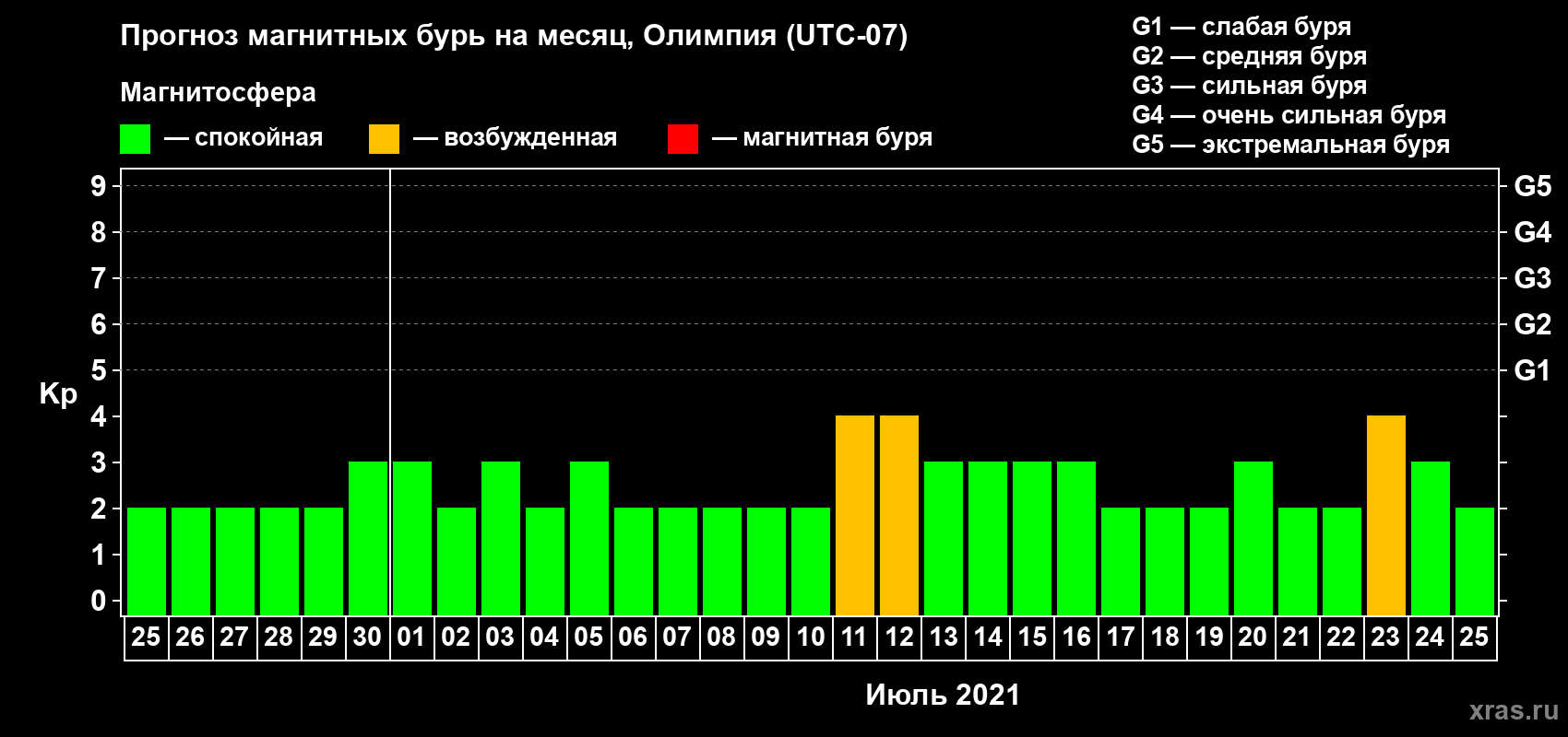 Прогноз магнитных бурь в Олимпии — 25 июня 2021 года