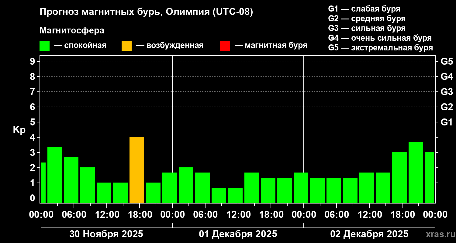 Прогноз магнитных бурь в Олимпии — 30 ноября 2025 года