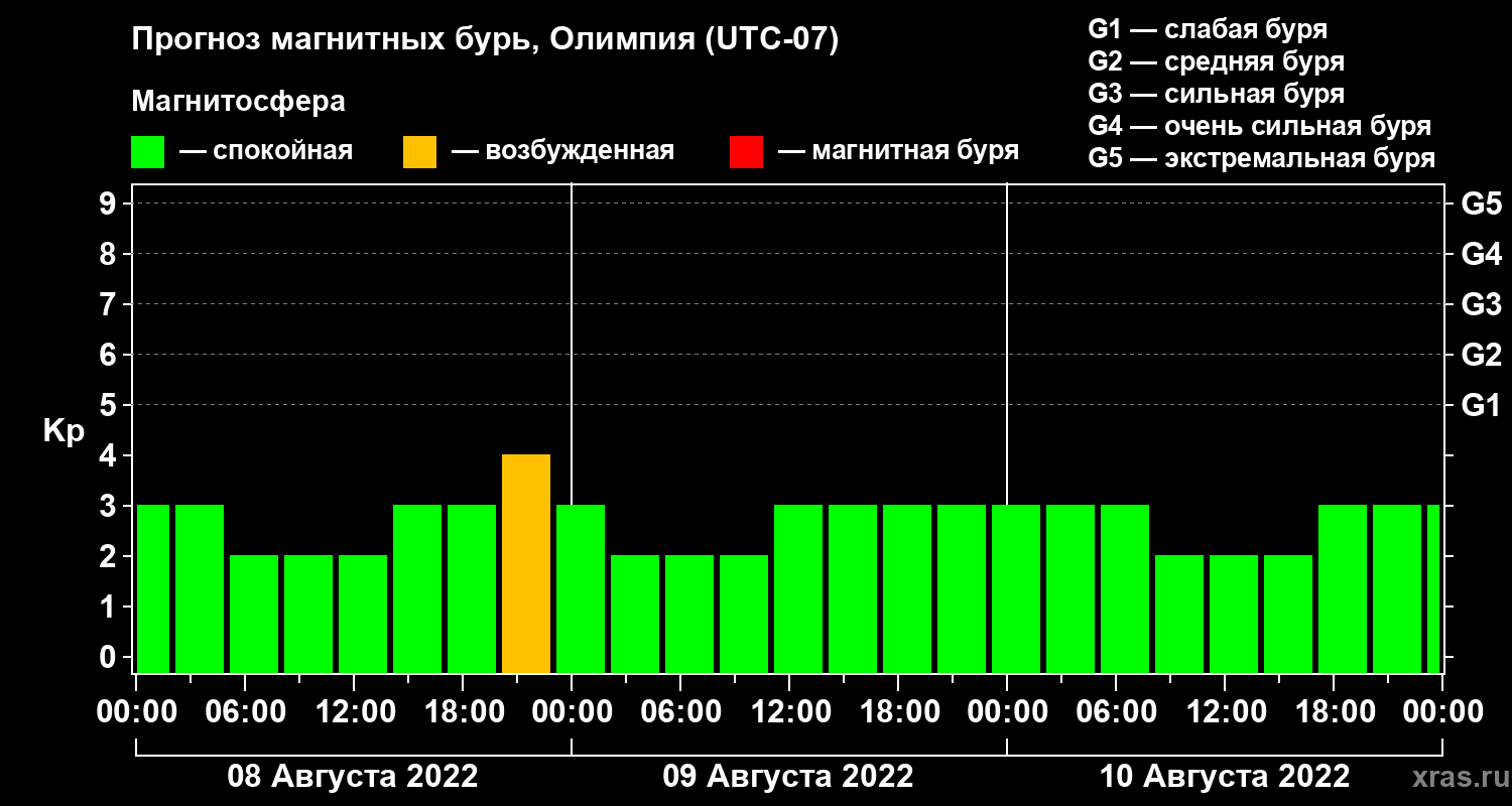 Прогноз магнитных бурь в Олимпии — 8 августа 2022 года