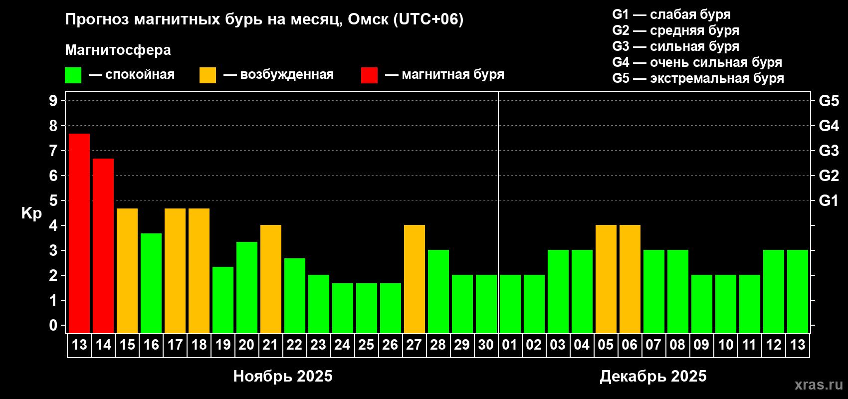 Прогноз магнитных бурь в Омске на 13 ноября 2025 года