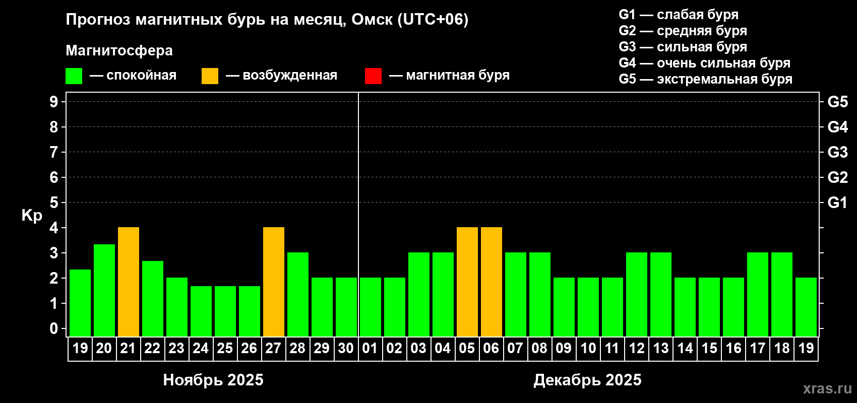 Прогноз магнитных бурь в Омске — 19 ноября 2025 года