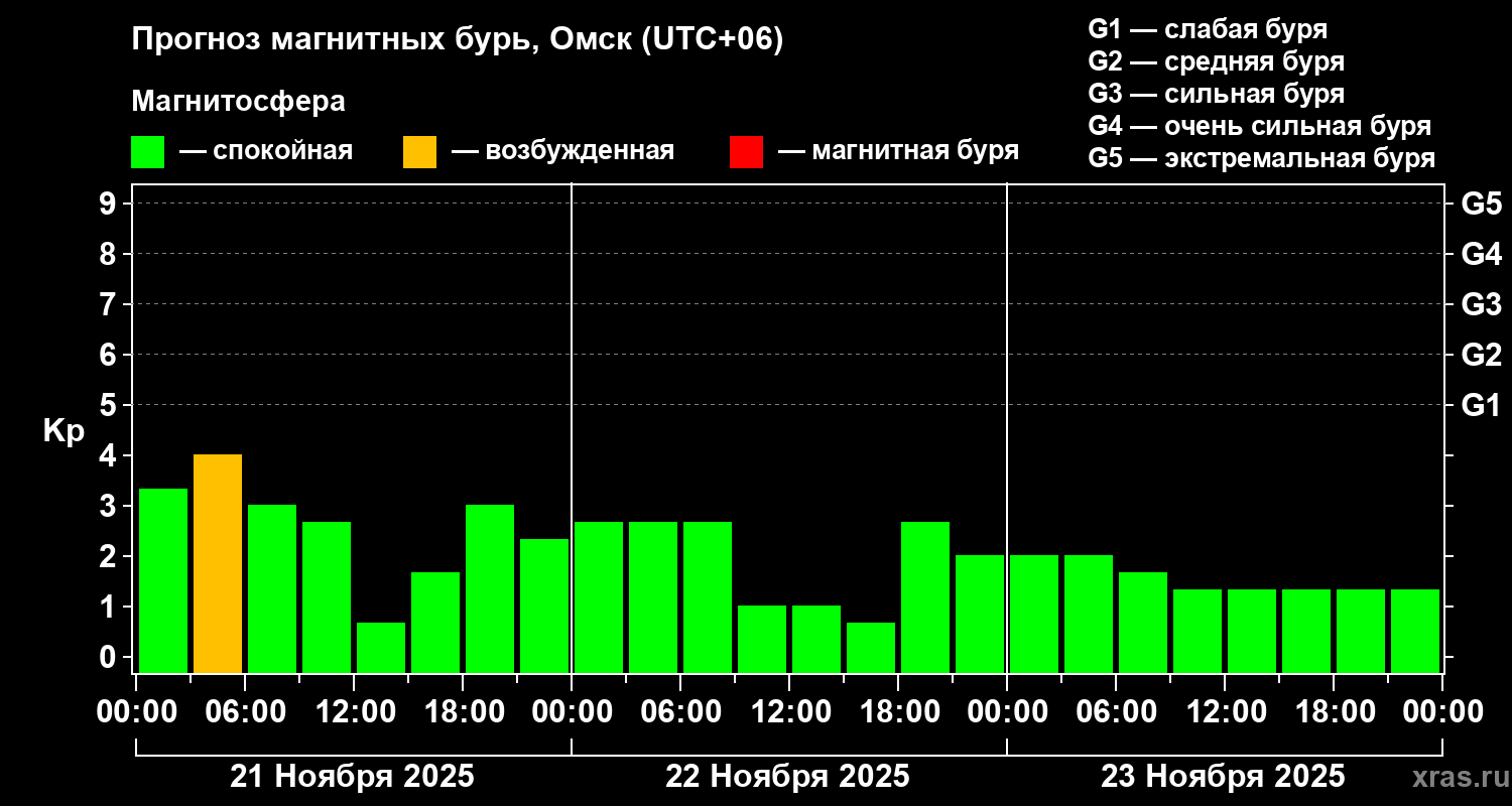 Прогноз магнитных бурь в Омске на 21 ноября 2025 года