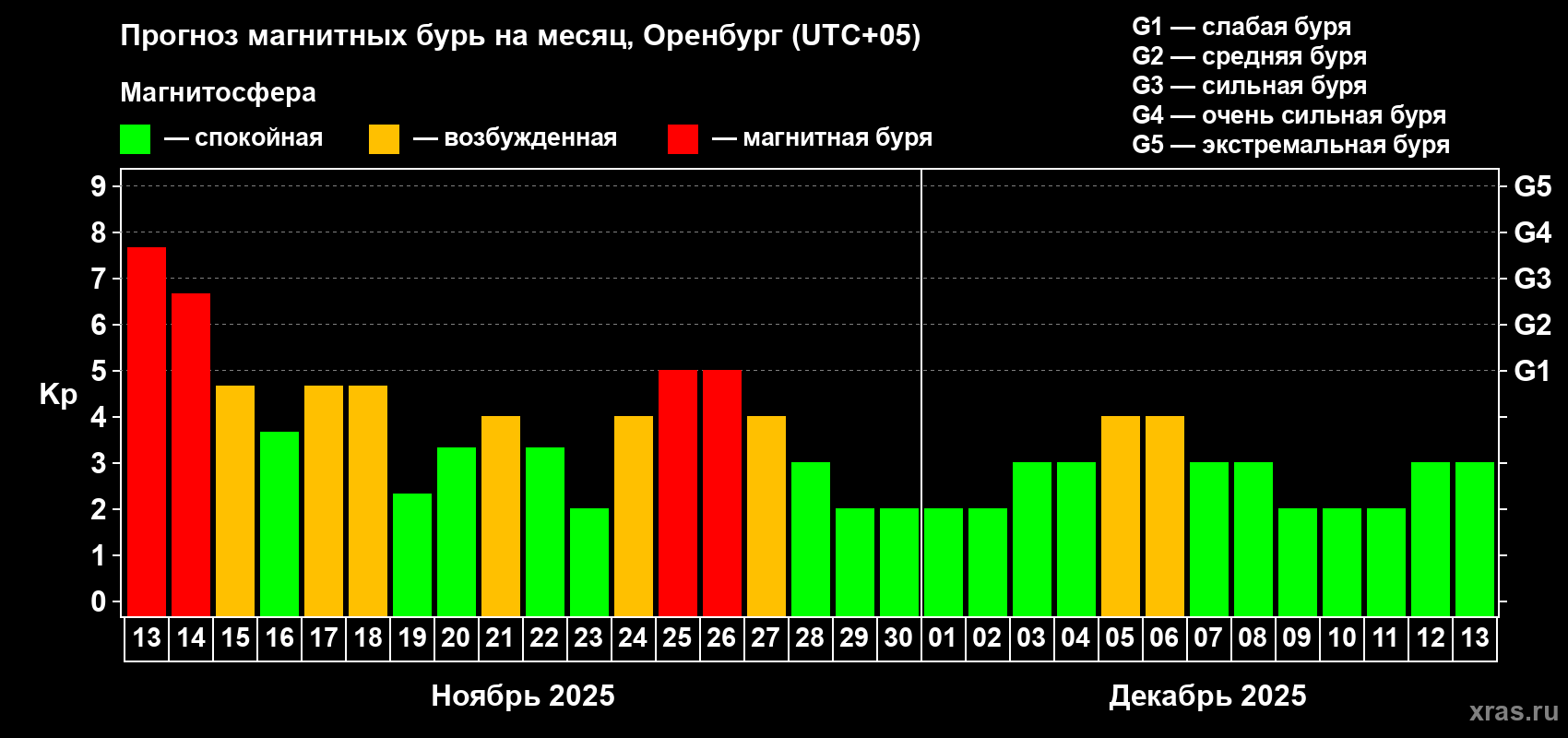 Прогноз магнитных бурь в Оренбурге — 13 ноября 2025 года