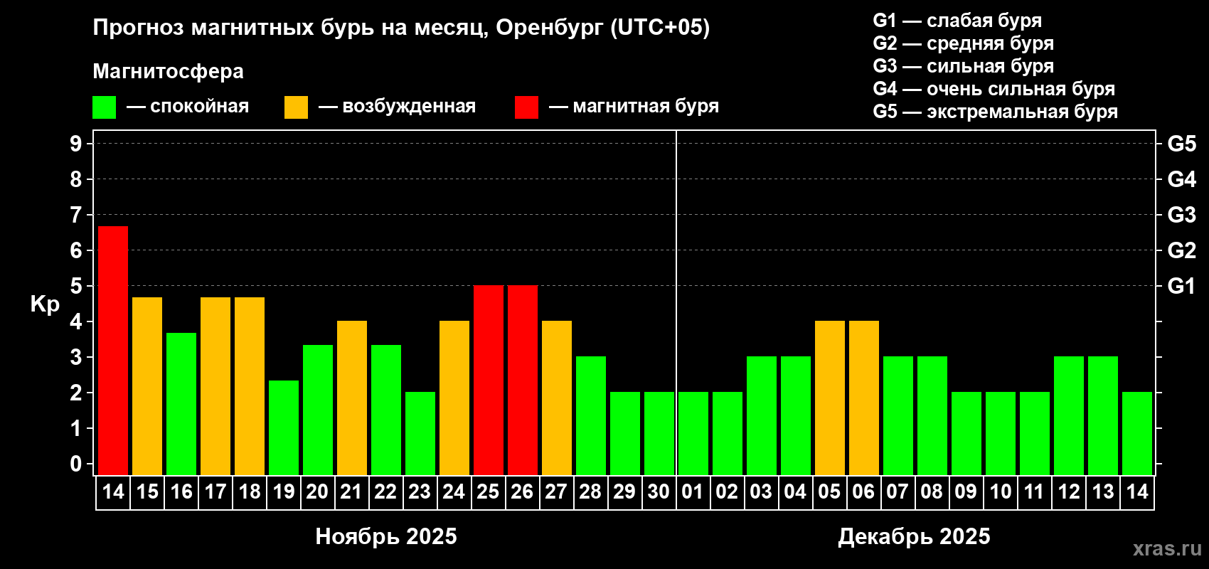 Прогноз магнитных бурь в Оренбурге — 14 ноября 2025 года