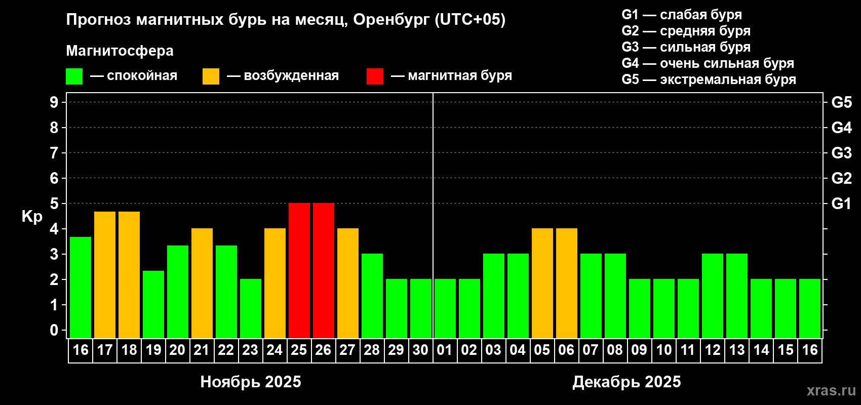 Прогноз магнитных бурь в Оренбурге — 16 ноября 2025 года