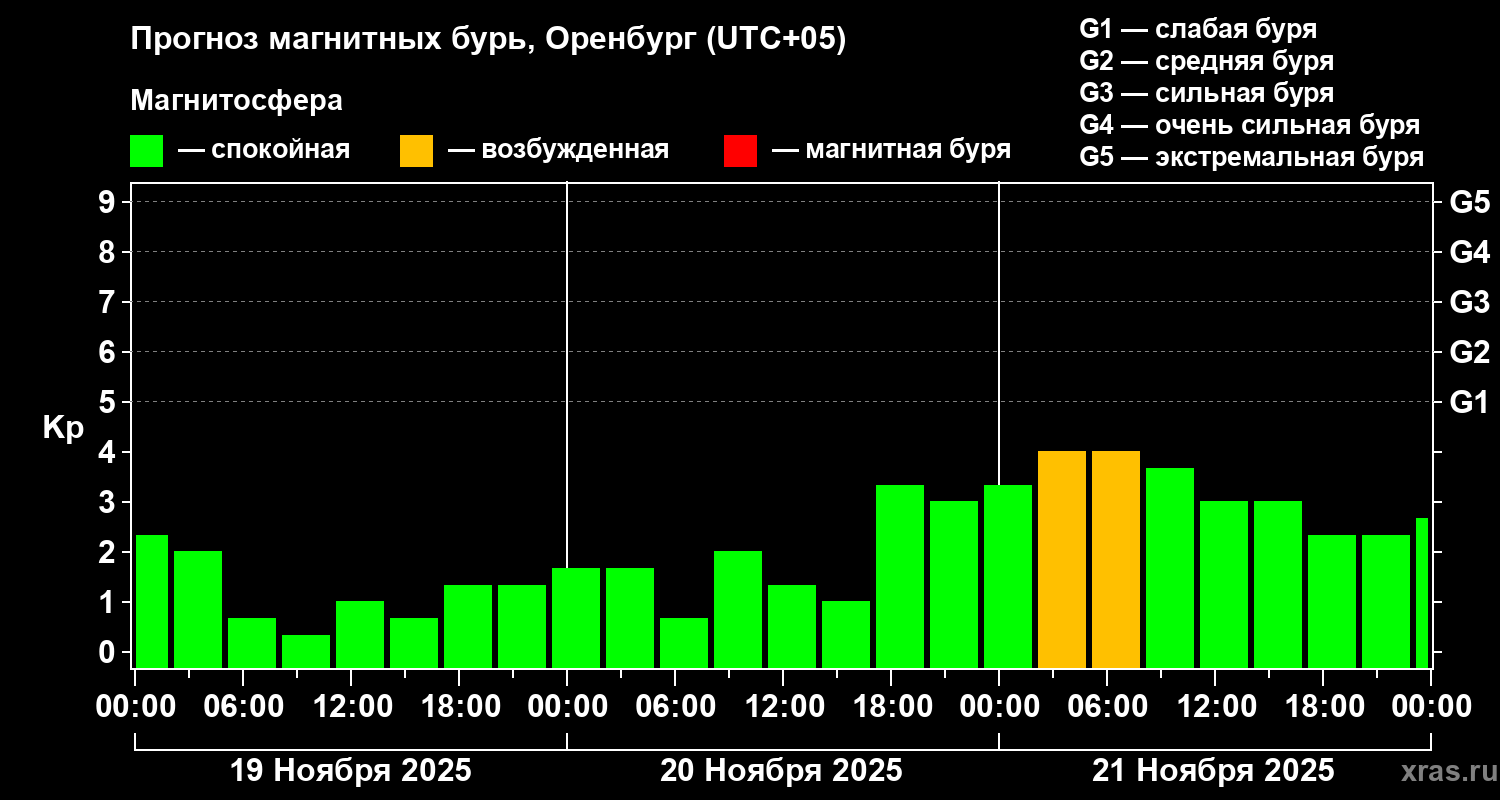 Прогноз магнитных бурь в Оренбурге — 19 ноября 2025 года