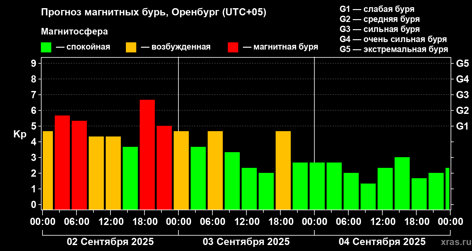 Прогноз магнитных бурь в Оренбурге на 2 сентября 2025 года