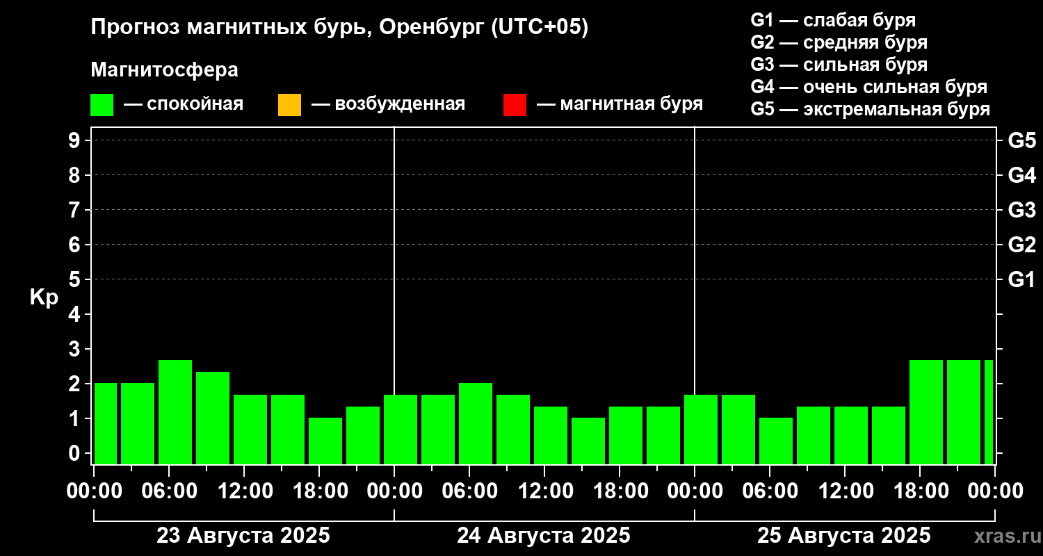 Прогноз магнитных бурь в Оренбурге — 23 августа 2025 года