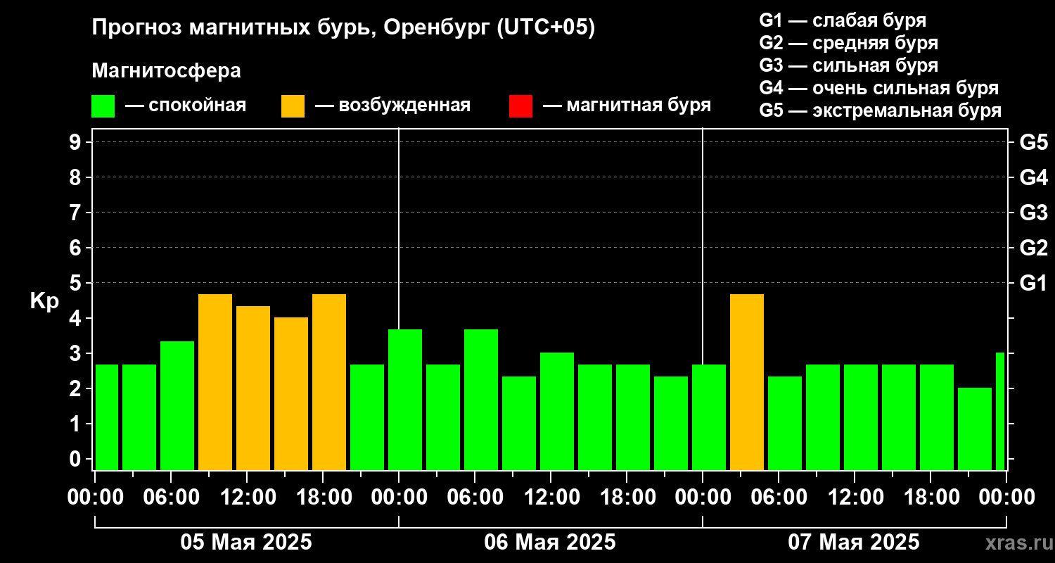 Прогноз магнитных бурь в Оренбурге — 5 мая 2025 года