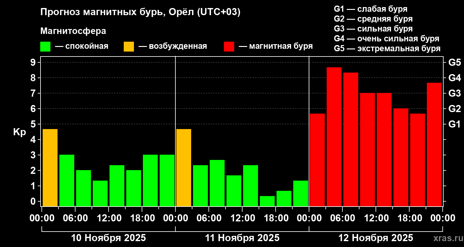 Прогноз магнитных бурь Орле на 10 ноября 2025 года