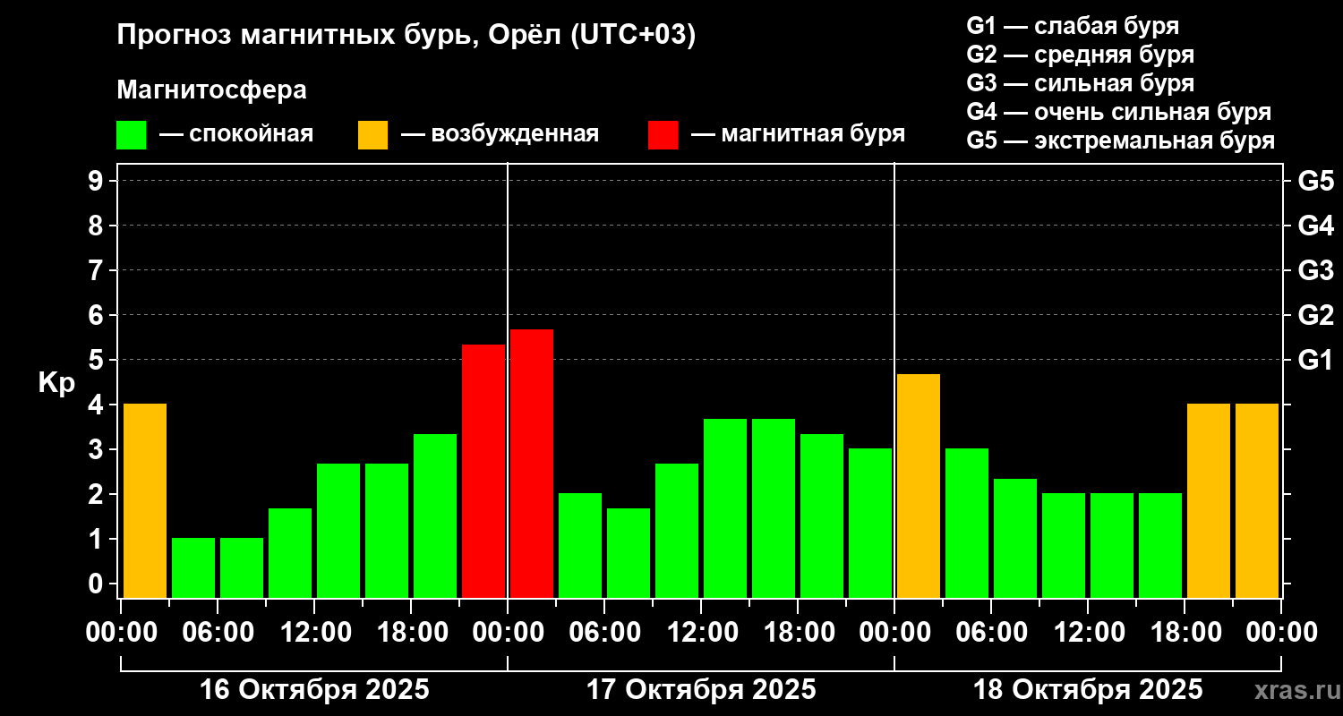 Прогноз магнитных бурь Орле на 16 октября 2025 года