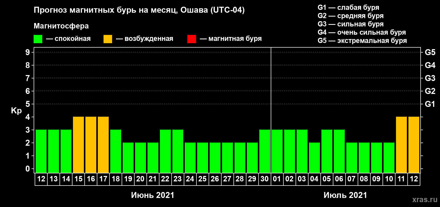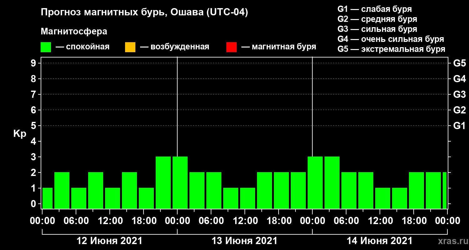 Прогноз магнитных бурь в Ошаве на 12 июня 2021 года