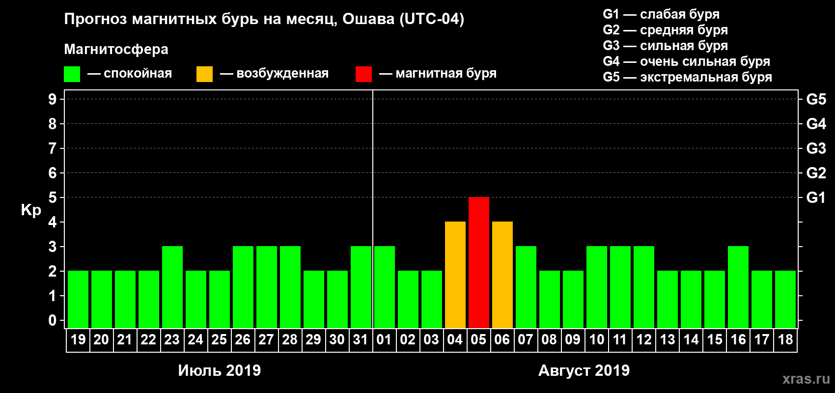 Прогноз магнитных бурь в Ошаве — 19 июля 2019 года