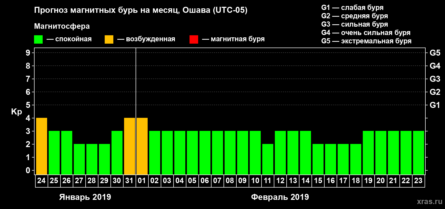 Прогноз магнитных бурь в Ошаве на 24 января 2019 года