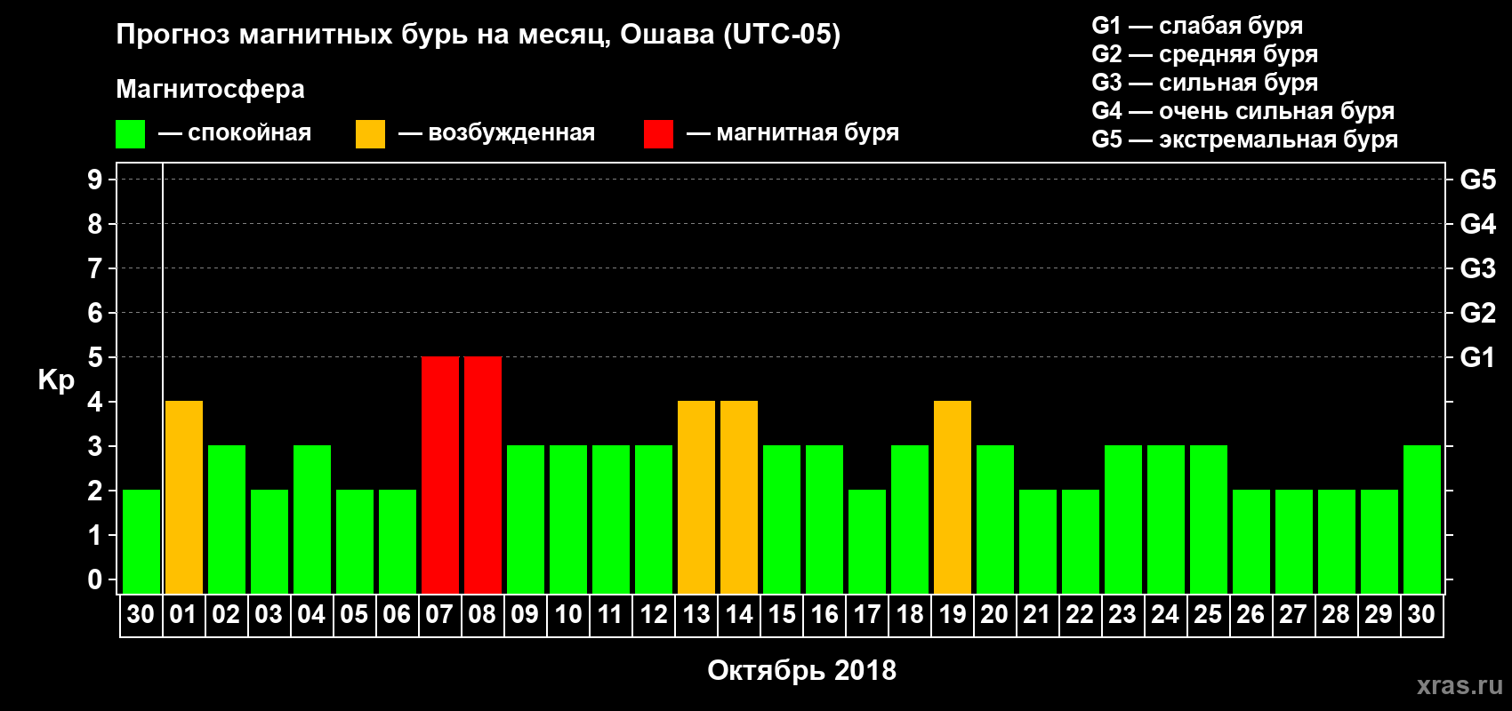 Прогноз магнитных бурь в Ошаве на 30 сентября 2018 года