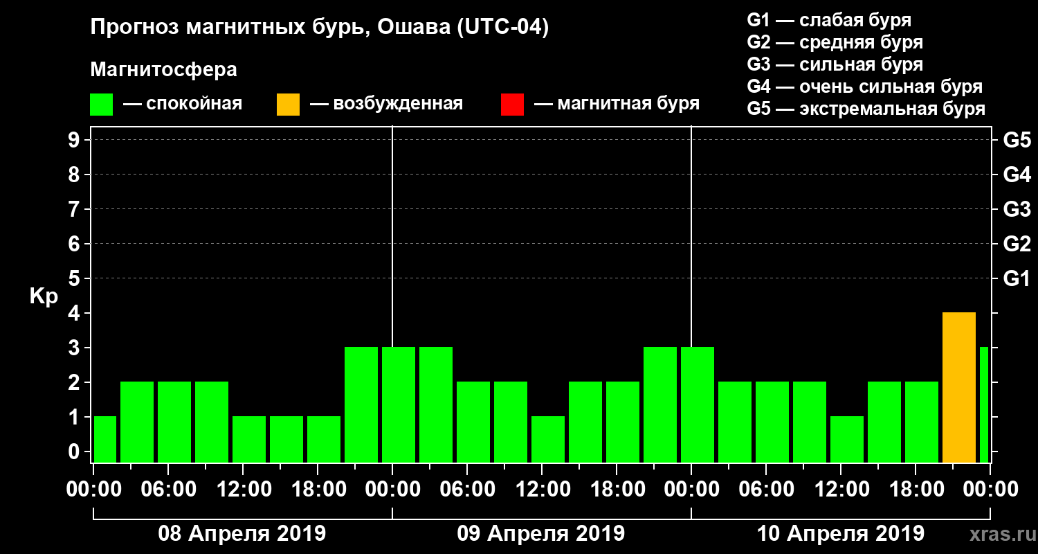 Прогноз магнитных бурь в Ошаве на 8 апреля 2019 года