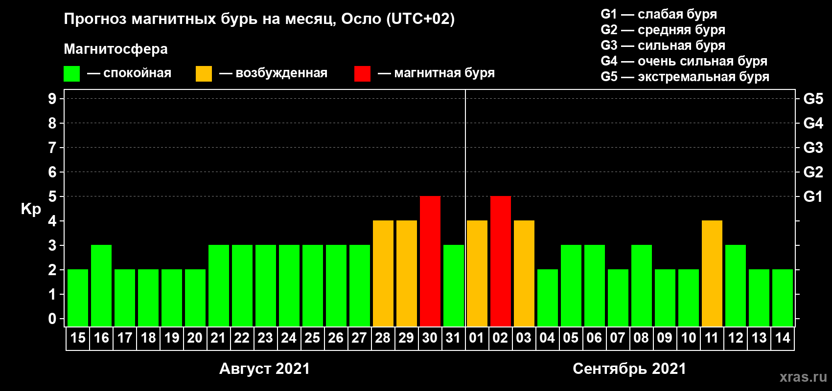 Прогноз магнитных бурь Осло на 15 августа 2021 года