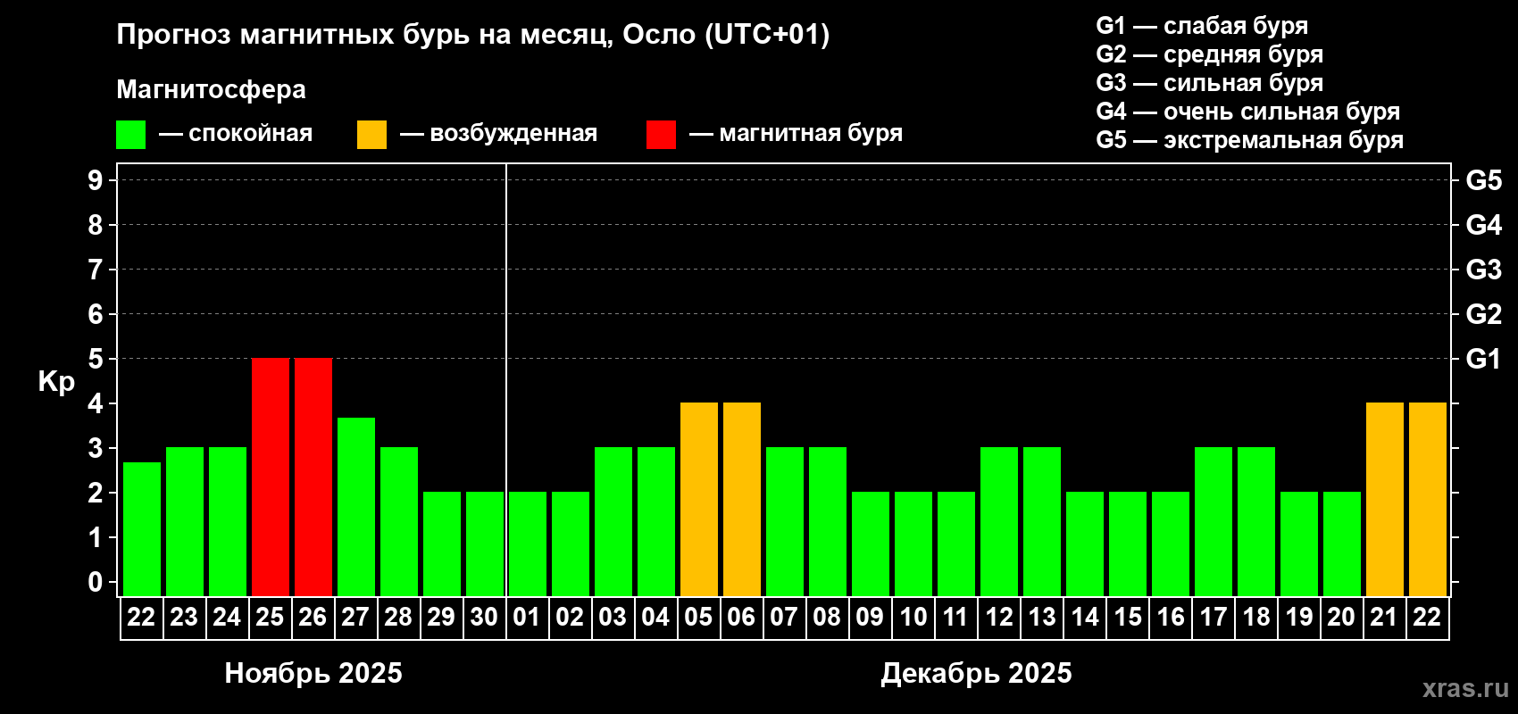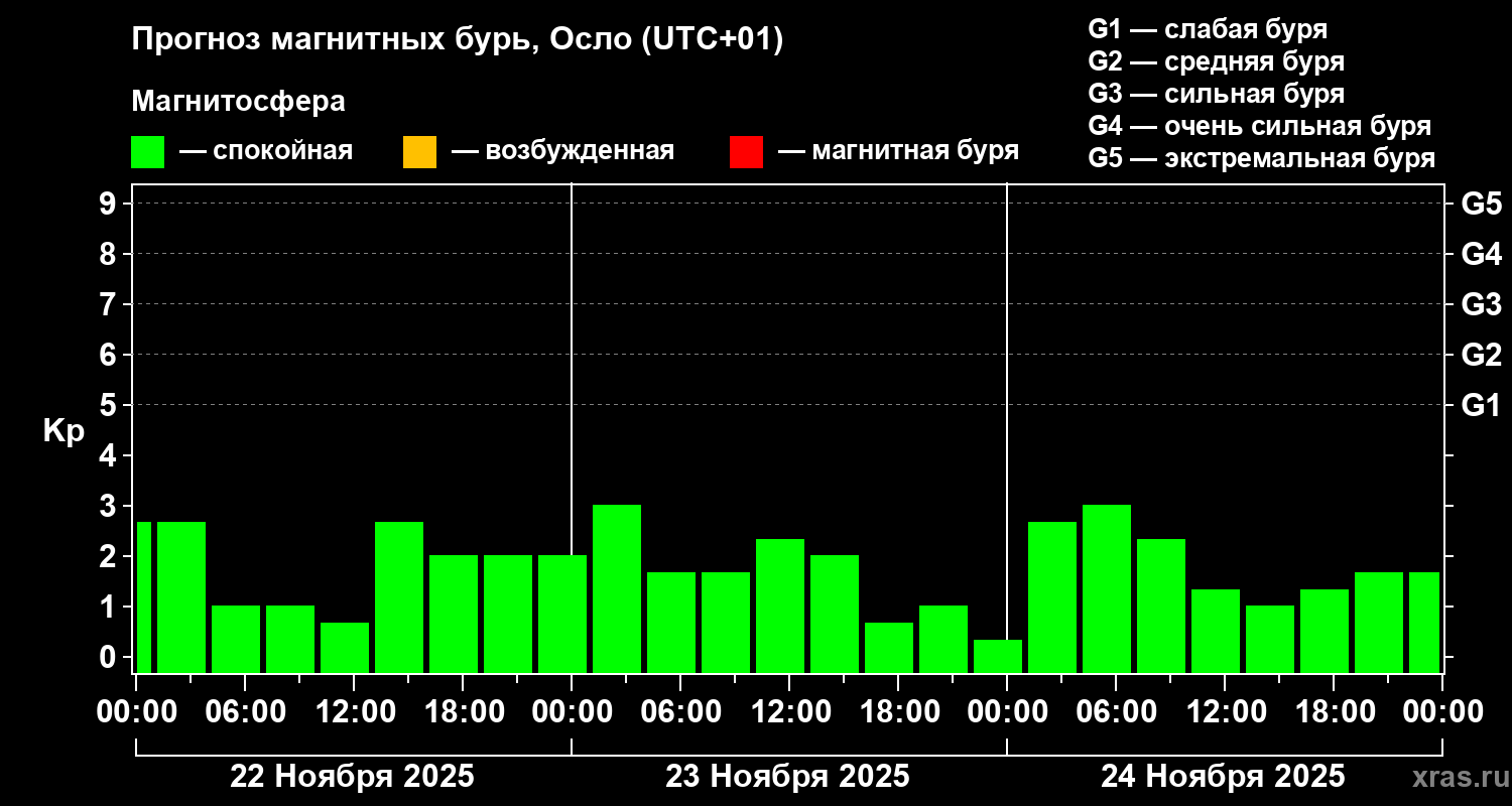 Прогноз магнитных бурь Осло на 22 ноября 2025 года