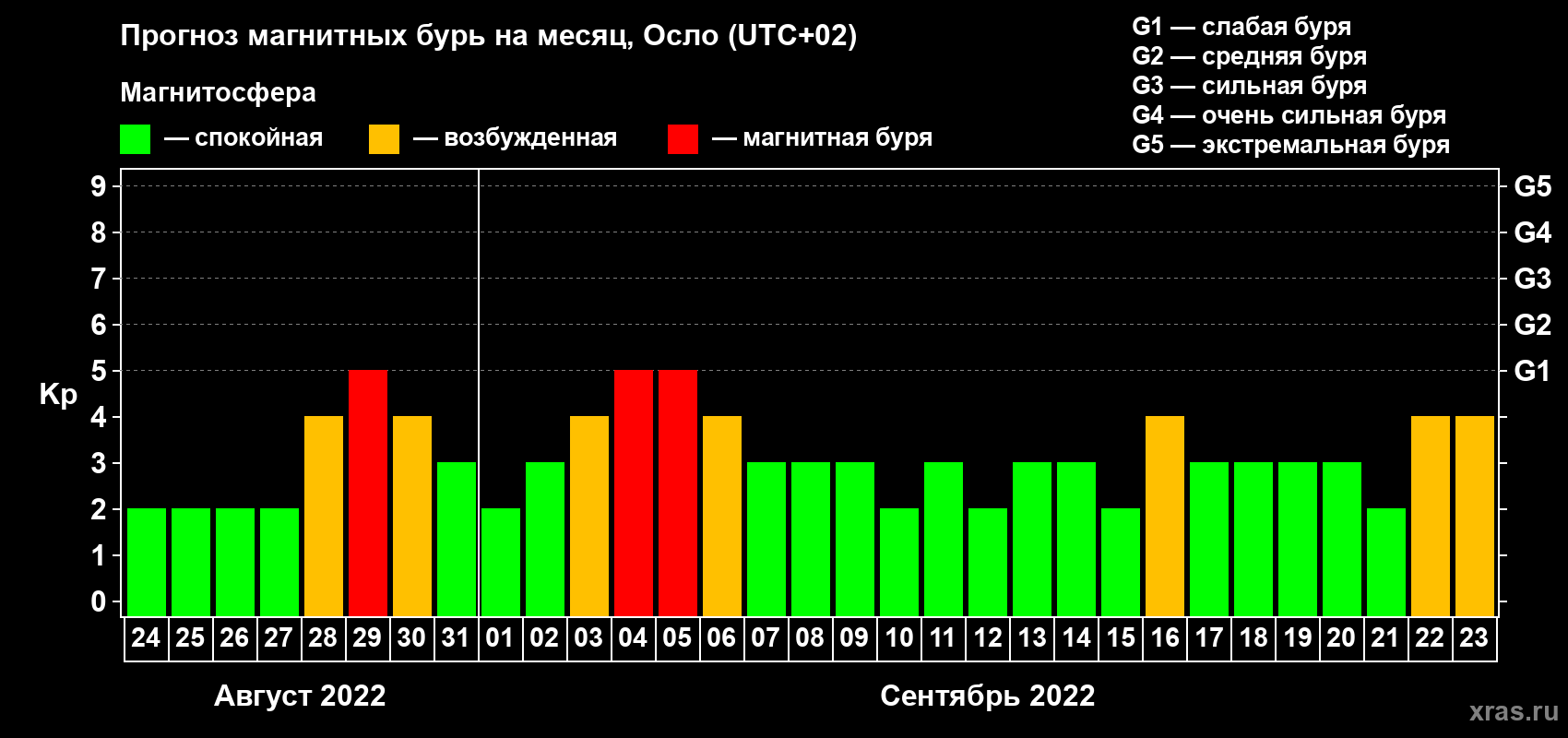 Прогноз магнитных бурь Осло на 24 августа 2022 года