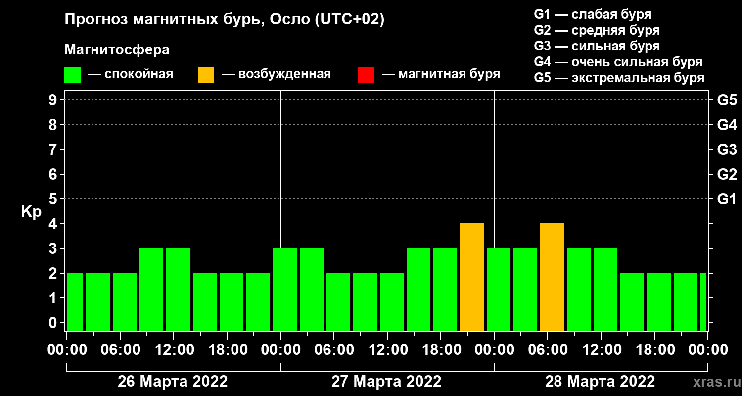Прогноз магнитных бурь Осло на 26 марта 2022 года