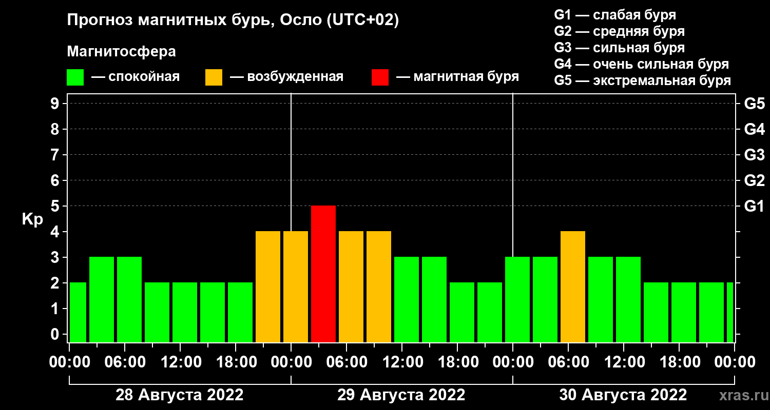 Прогноз магнитных бурь Осло на 28 августа 2022 года