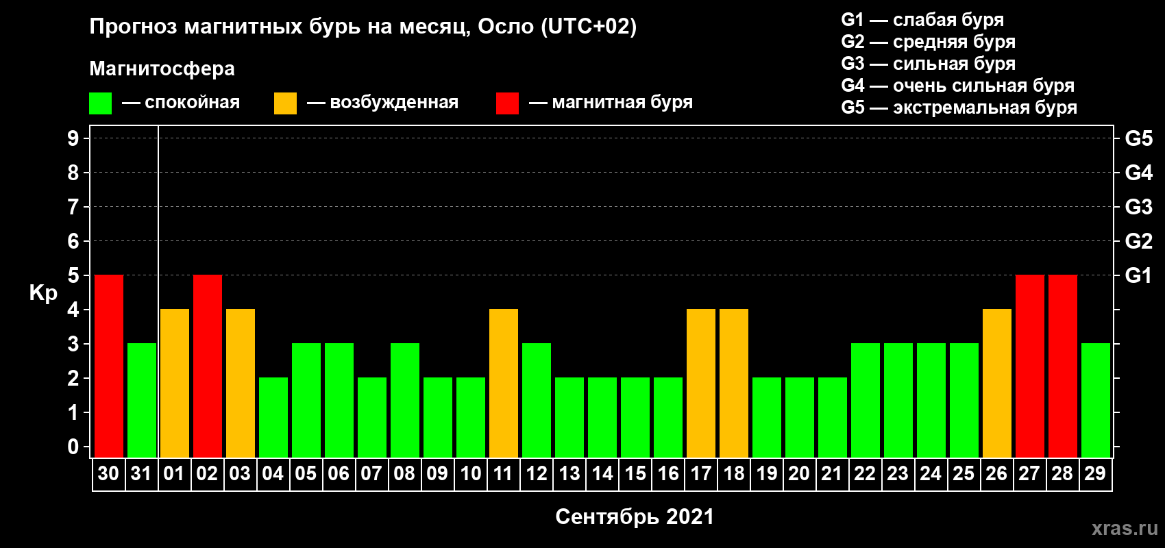 Прогноз магнитных бурь Осло на 30 августа 2021 года