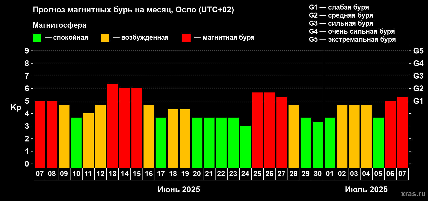 Прогноз магнитных бурь Осло — 7 июня 2025 года