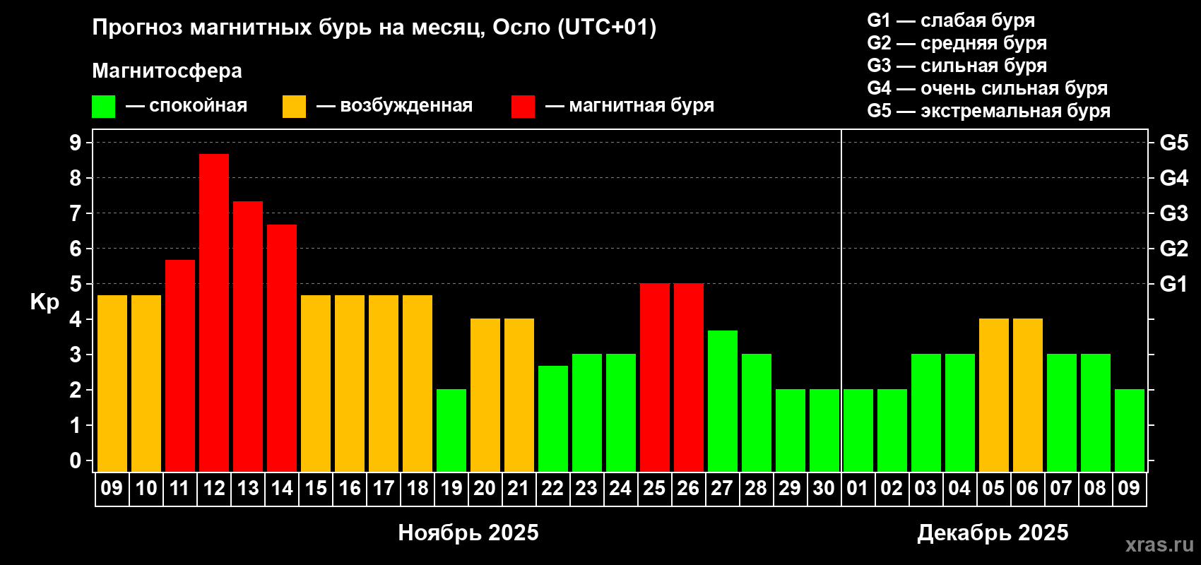 Прогноз магнитных бурь Осло на 9 ноября 2025 года