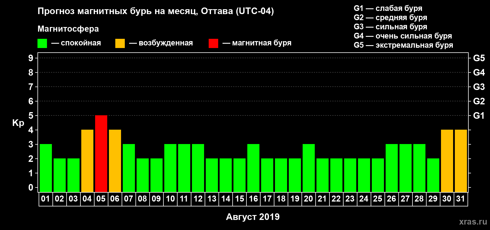 Прогноз магнитных бурь в Оттаве на 1 августа 2019 года
