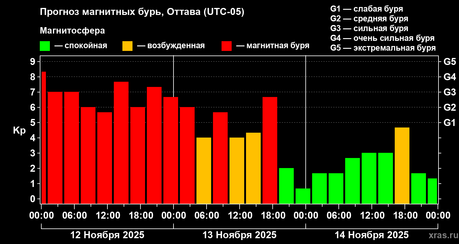 Прогноз магнитных бурь в Оттаве — 12 ноября 2025 года