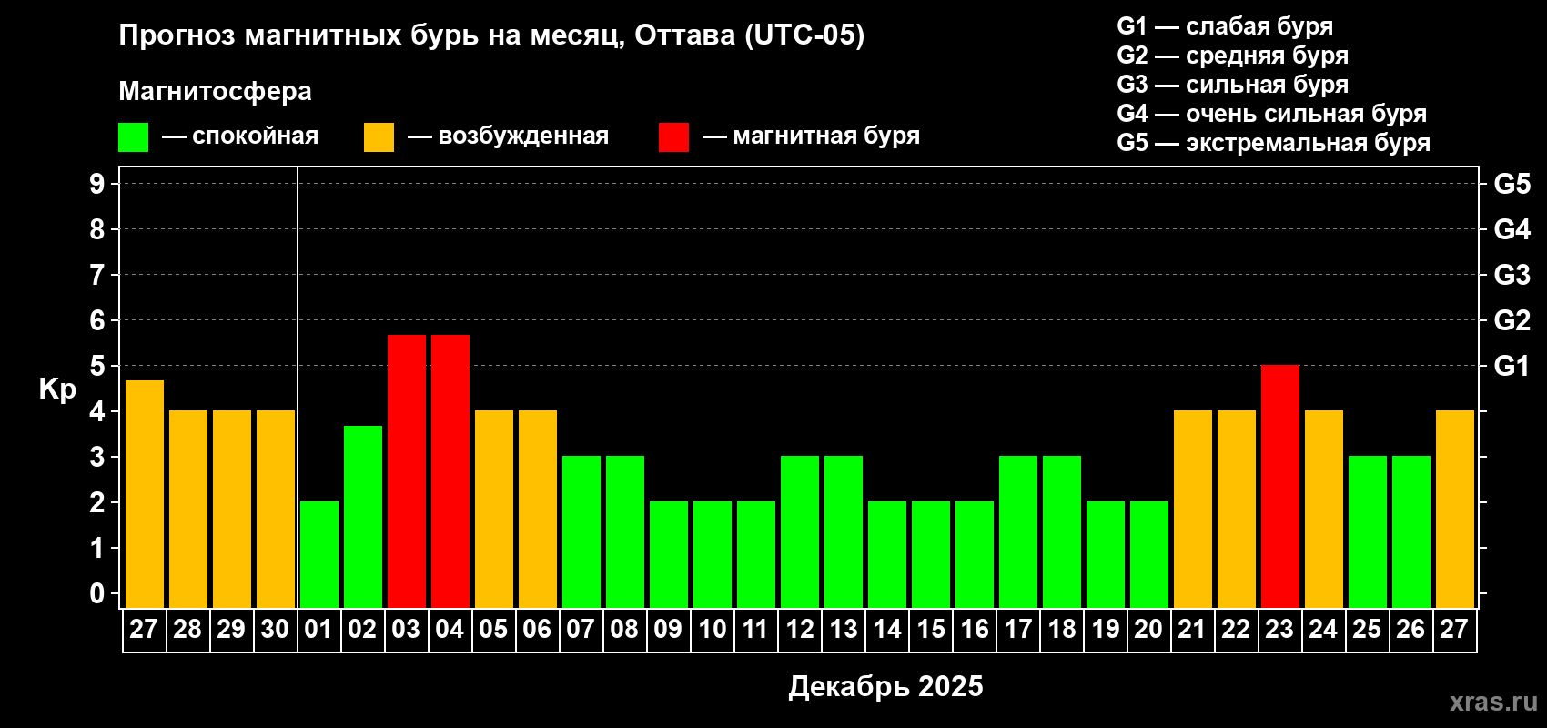 Прогноз магнитных бурь в Оттаве — 27 ноября 2025 года