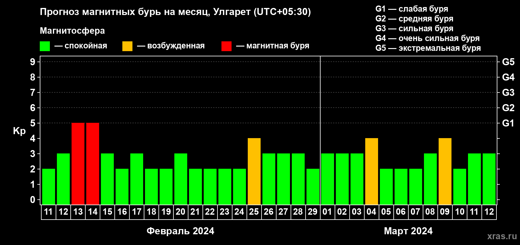 Прогноз магнитных бурь в Улгарете — 11 февраля 2024 года