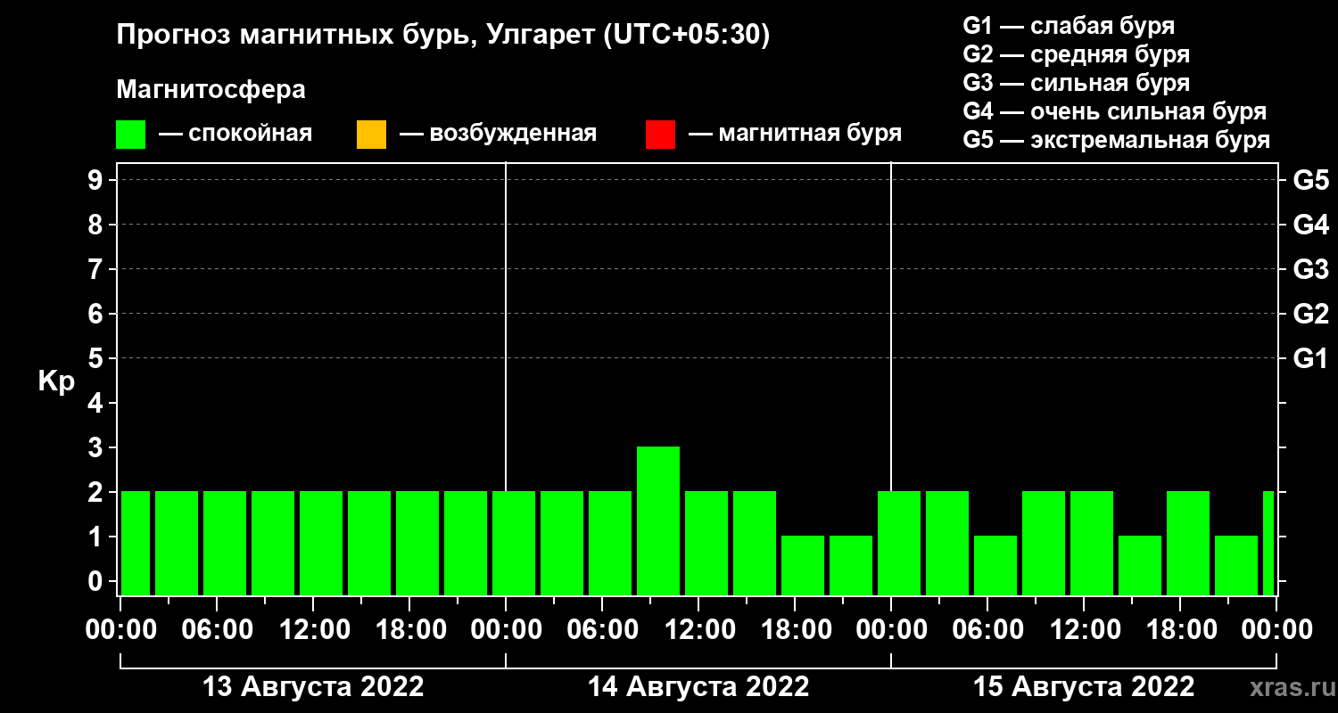 Прогноз магнитных бурь в Улгарете на 13 августа 2022 года