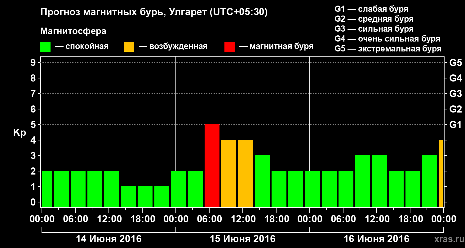 Прогноз магнитных бурь в Улгарете на 14 июня 2016 года