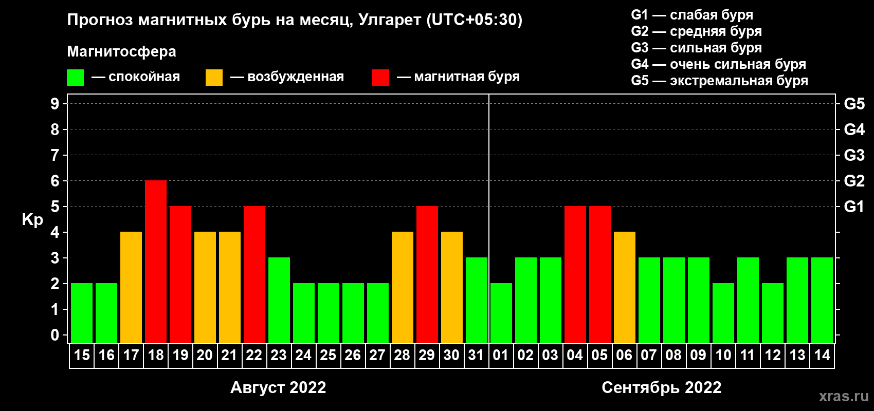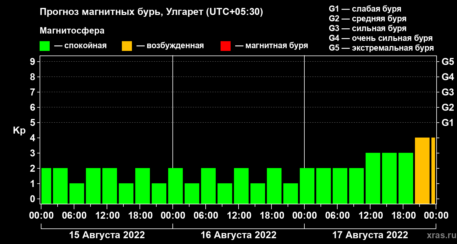 Прогноз магнитных бурь в Улгарете на 15 августа 2022 года