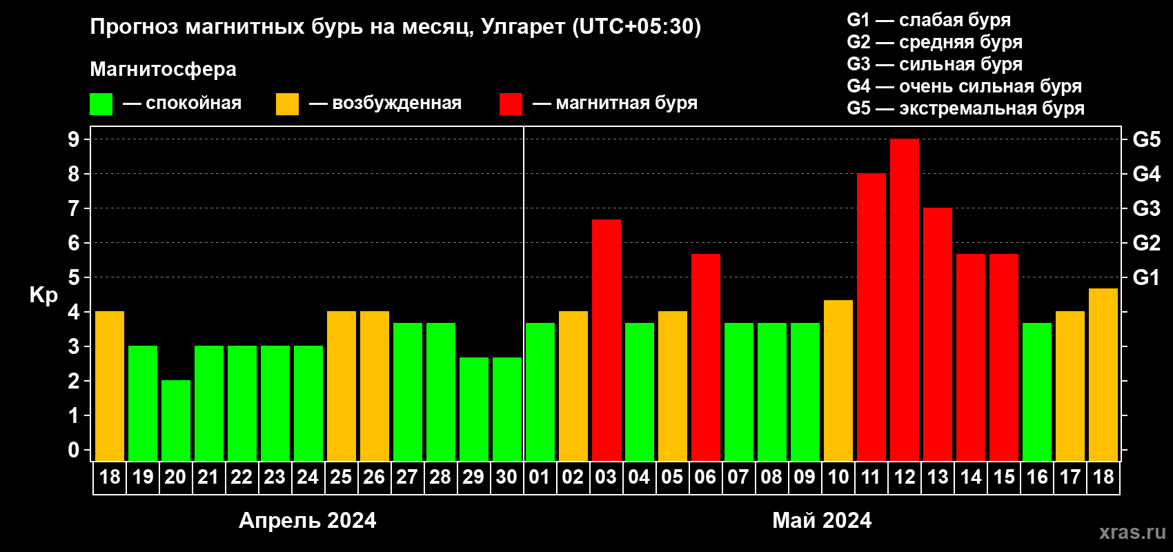 Прогноз магнитных бурь в Улгарете — 18 апреля 2024 года
