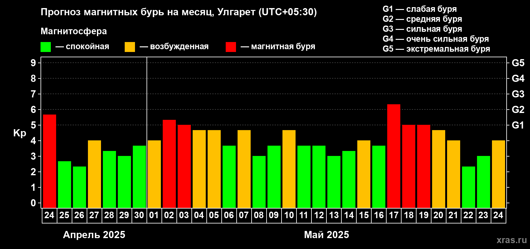 Прогноз магнитных бурь в Улгарете — 24 апреля 2025 года