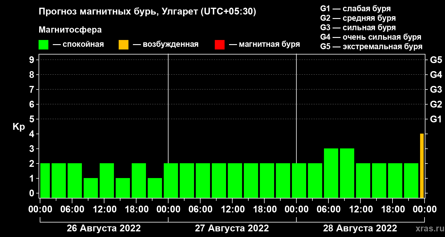 Прогноз магнитных бурь в Улгарете на 26 августа 2022 года