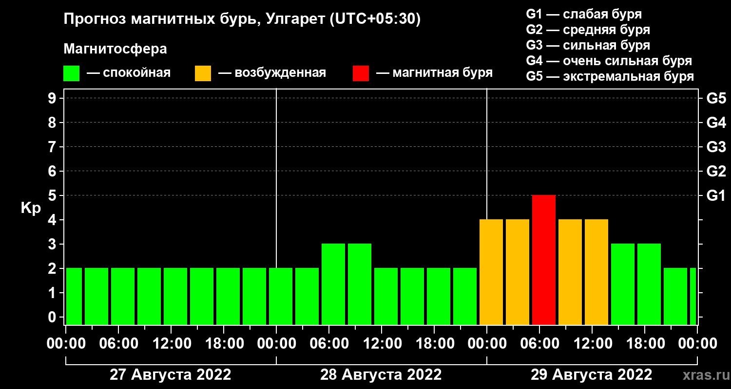Прогноз магнитных бурь в Улгарете на 27 августа 2022 года