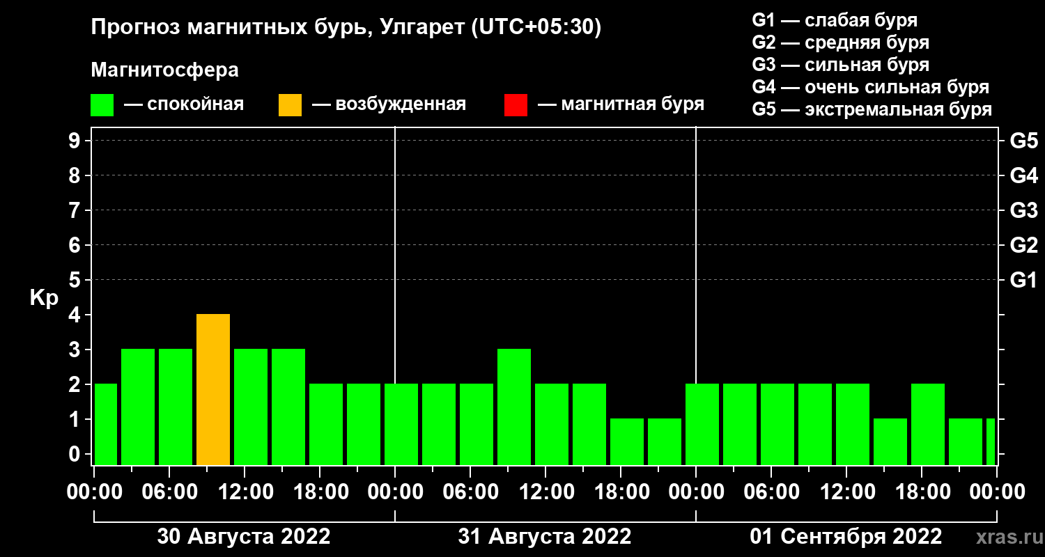 Прогноз магнитных бурь в Улгарете на 30 августа 2022 года