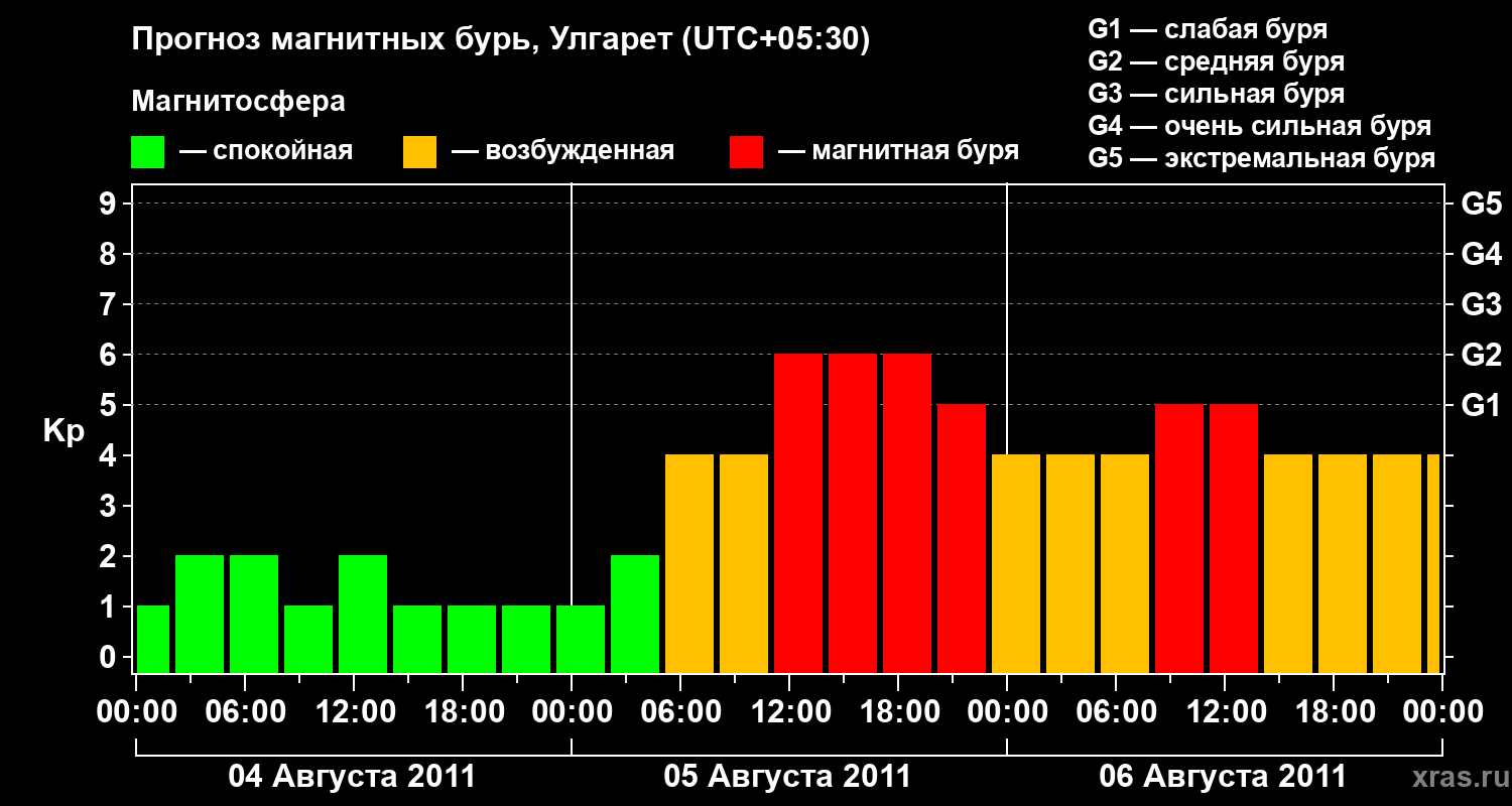 Прогноз магнитных бурь в Улгарете на 4 августа 2011 года