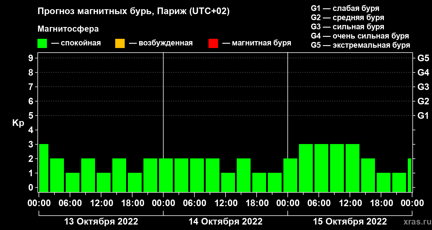 Прогноз магнитных бурь в Париже на 13 октября 2022 года