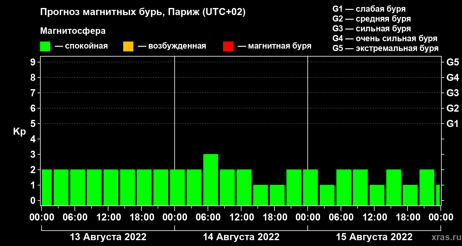 Прогноз магнитных бурь в Париже на 13 августа 2022 года