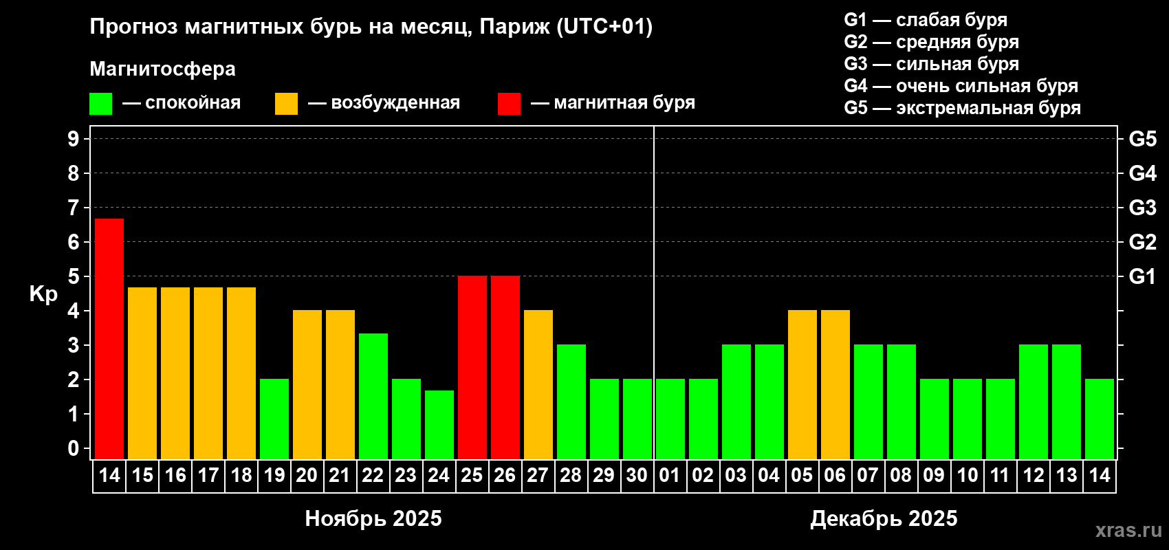 Прогноз магнитных бурь в Париже на 14 ноября 2025 года