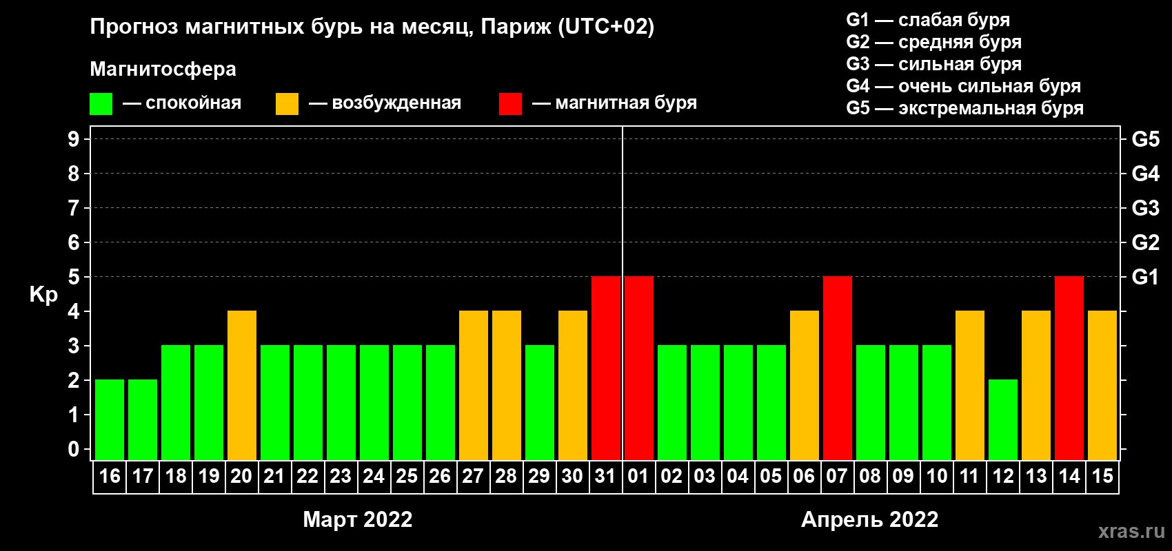 Прогноз магнитных бурь в Париже — 16 марта 2022 года