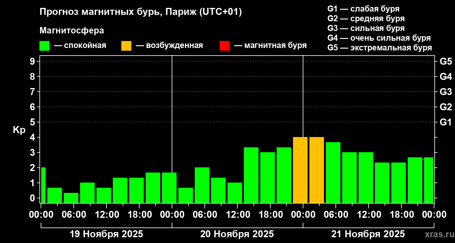 Прогноз магнитных бурь в Париже на 19 ноября 2025 года