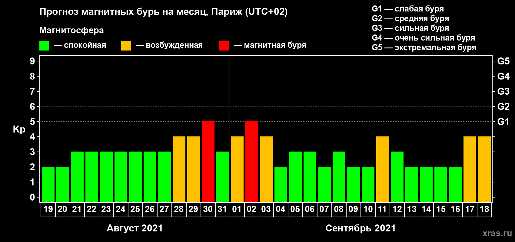Прогноз магнитных бурь в Париже на 19 августа 2021 года