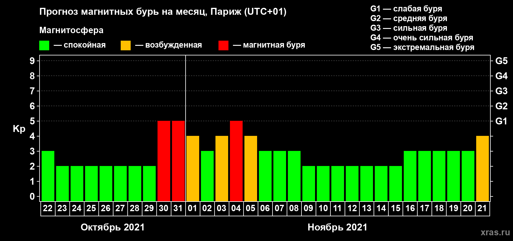 Прогноз магнитных бурь в Париже — 22 октября 2021 года